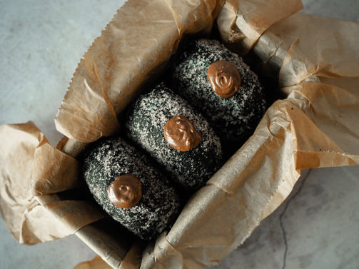 Creamy whipped Dalgona coffee filling encased in Singapore's first ever charcoal donuts.